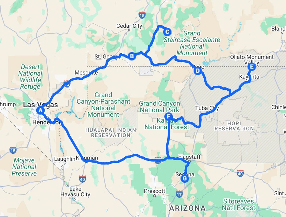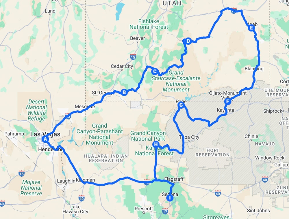 Zo ziet de route van de rondreis Utah Arizona van 3 weken eruit op de kaart.