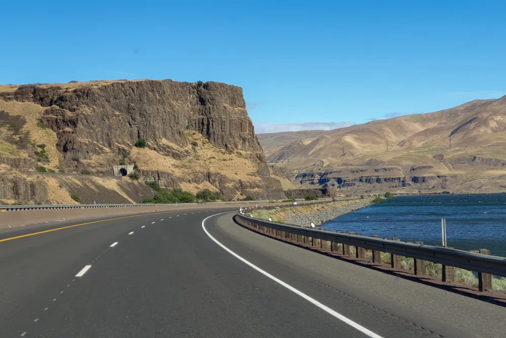 Zodra je Cottonwood Canyon State Park uitrijdt, verandert het landschap weer. In de verte doemen de vulkanen op: links Mount Hood, en met een beetje geluk zie je bij helder weer zelfs Mount Rainier. Bij de Columbia River volg je de rivier westwaarts richting Portland, een route die steeds groener en weelderiger wordt.
