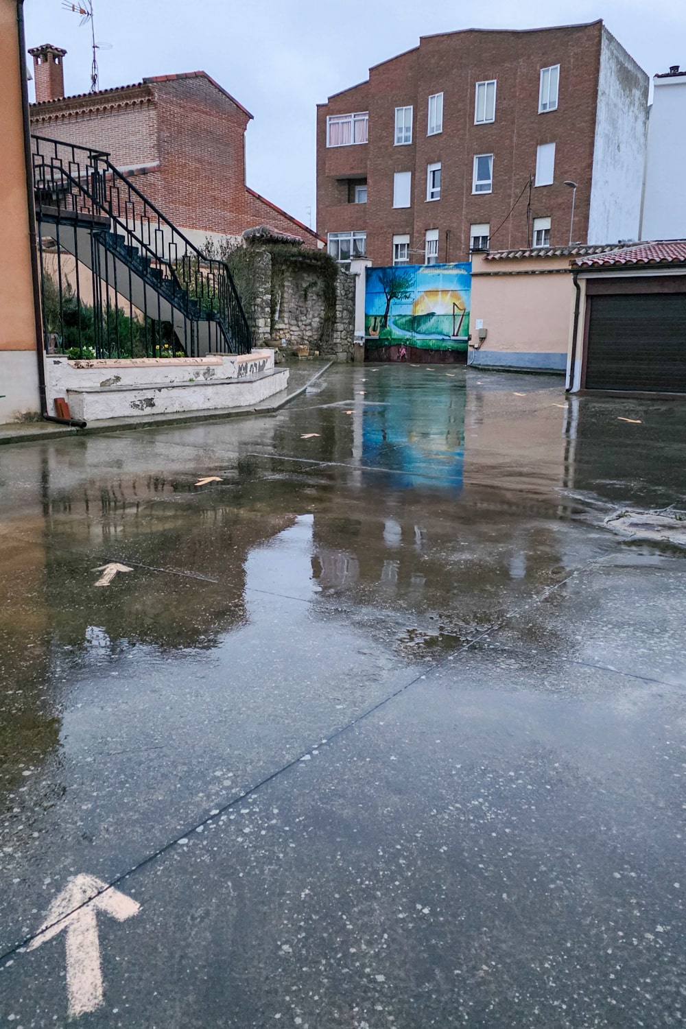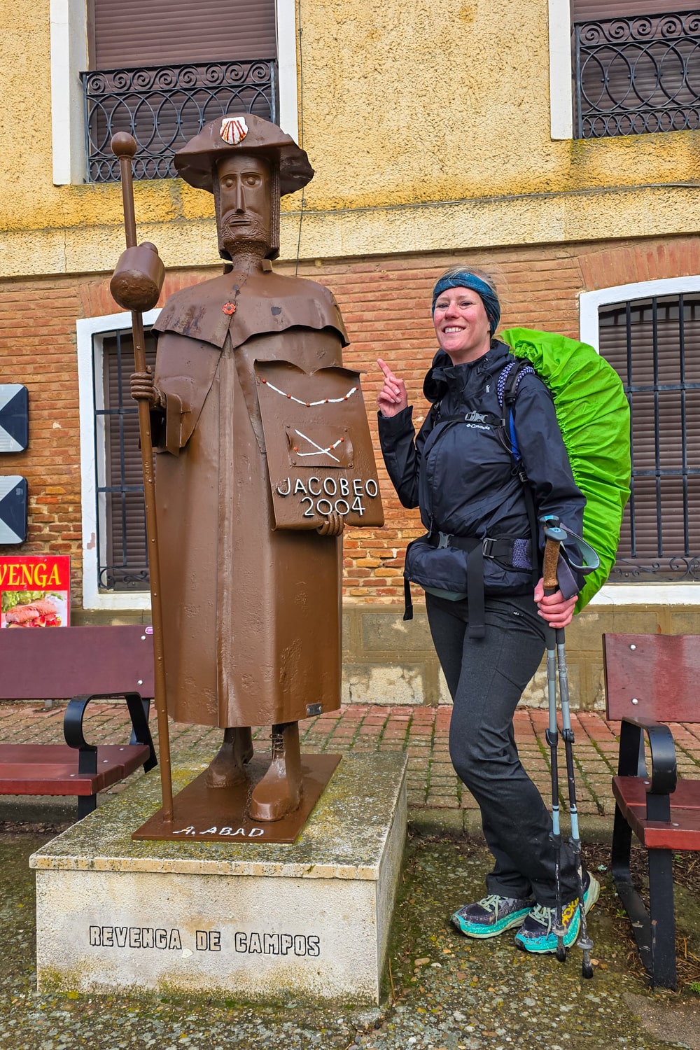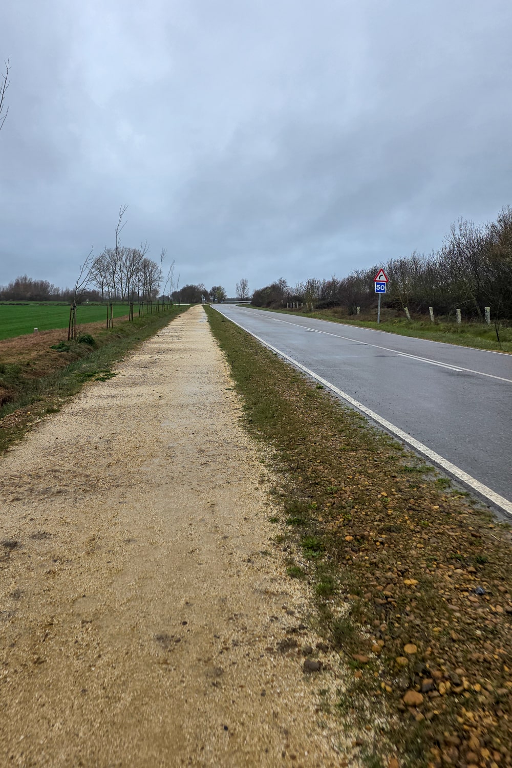 De 17 kilometer is namelijk een lange rechte weg zonder mogelijkheden om te schuilen. Urenlang beukt de wind en de regen in mijn gezicht, tussendoor probeer ik de grootste waterplassen op het pad te vermijden. Het is zwaar, vooral mentaal. Het enige wat ik kan bedenken is dat elke stap die ik zet me dichterbij Santiago brengt.