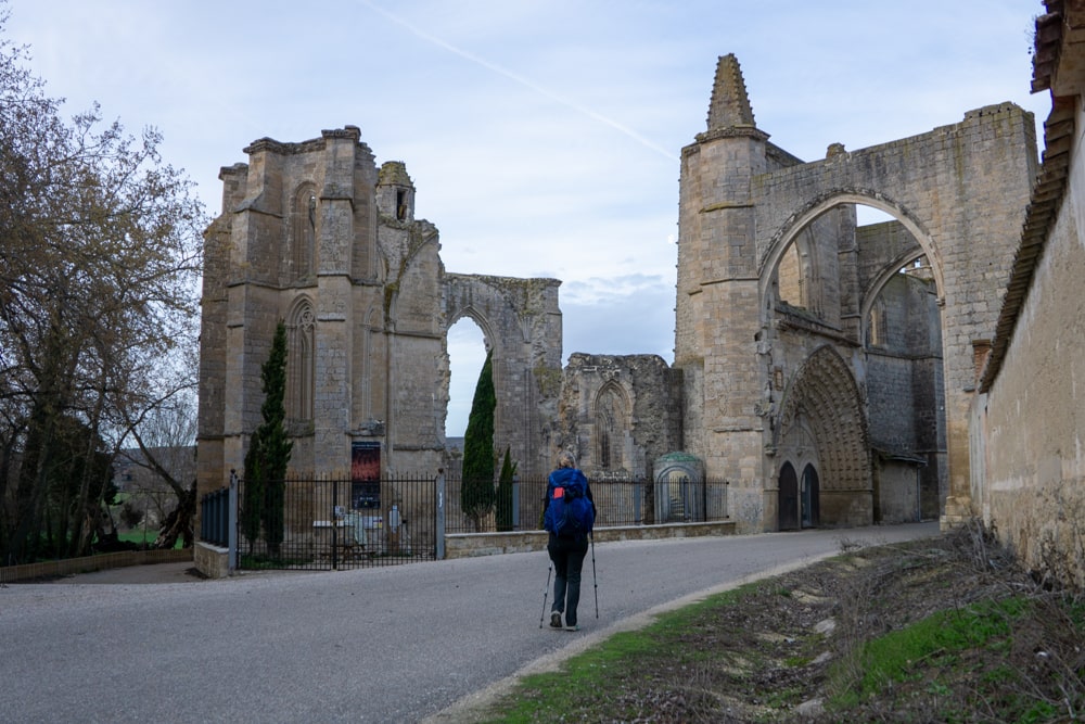 Vandaag is in ieder geval een goede dag, lekker geslapen en ik ga al om half zeven van start. Hoofdlamp is eigenlijk niet nodig, zelfs in het donker is het pad goed te volgen. Bovendien wordt het snel licht. In de vroege ochtend zijn de vogelgeluiden echt oorverdovend en ik zie zelfs een hertje door de weilanden schieten, prachtig. Via een indrukwekkende ruïne van een klooster wandel ik naar Castrojeriz, een schilderachtig dorpje waar ik een tortilla verorber.