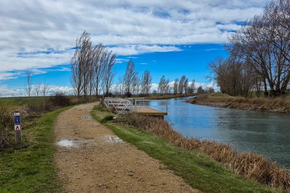 Yoshi is inmiddels ook weer van de partij en we lopen samen de resterende kilometers naar Frómista. Nog best pittig, maar gelukkig heeft de regen plaatsgemaakt voor wind. Een “gratis” droger. Het laatste stuk gaat langs een kanaal en het voelt voor mij net als ik in Nederland ben. De eigenaar van het hostel in Frómista spreekt ook een beetje Nederlands, hoe toevallig?