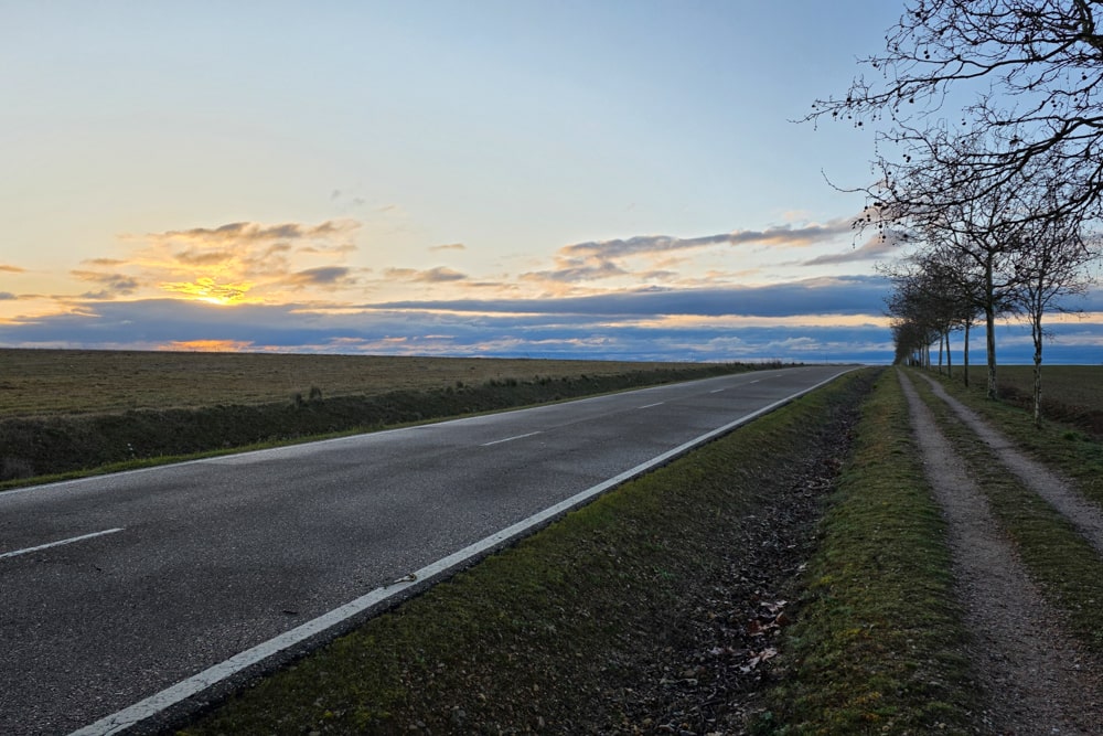 Het is -1 als ik samen met Yoshi de deur uitstap. En helder, het gaat niet regenen vandaag! De zon kruipt snel omhoog en het heuvelachtige groene landschap is schitterend. Aan de noordkant zien we een reeks besneeuwde bergtoppen. Hoewel ze zo’n 100 kilometer verderop liggen, zijn de Picos de Europa goed zichtbaar, heel gaaf!