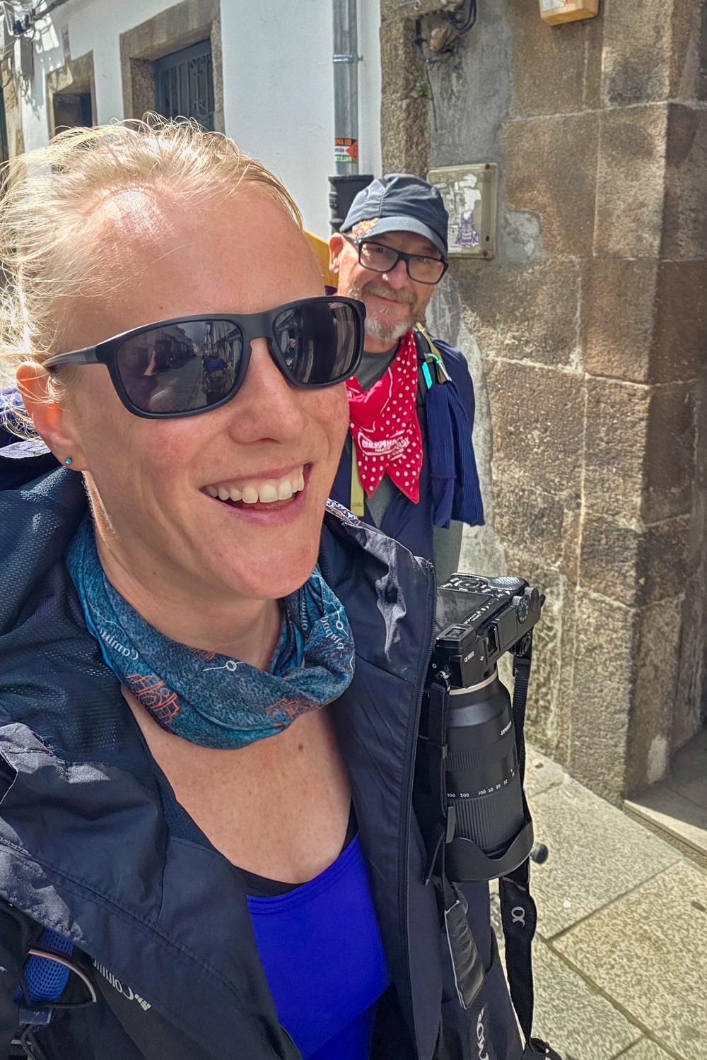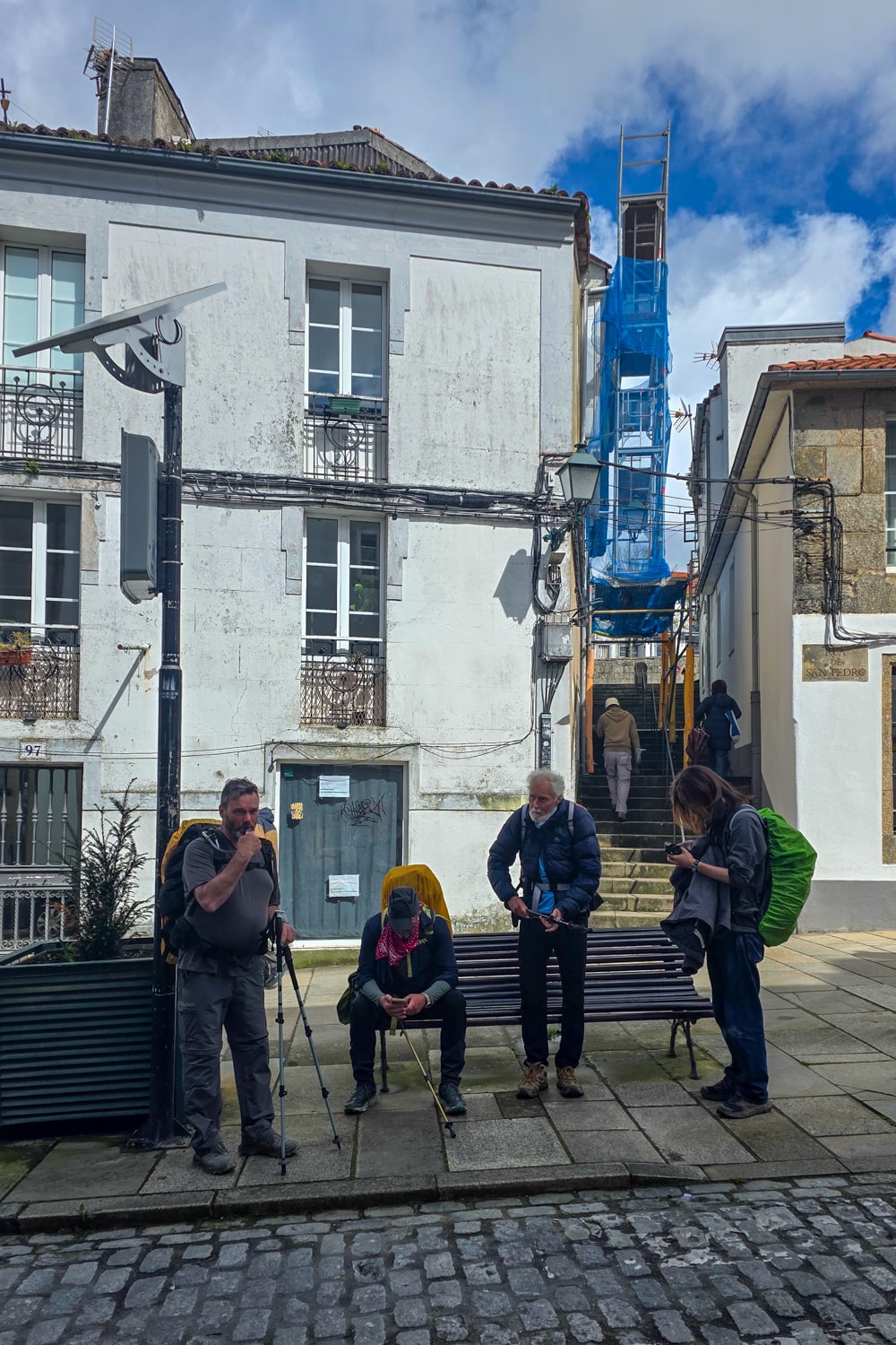 Langzaam verdwijnen de groene heuvels en lopen we echt Santiago in. We zijn inmiddels iets vrolijker en kletsen voluit. Het groepje wordt langzaam groter, Gene, Rob en Andrew sluiten ook aan. Met z’n zevenen lopen we de oude binnenstad in, die ik nog herken van mijn eerdere bezoek. Hoe anders is mijn gevoel nu!