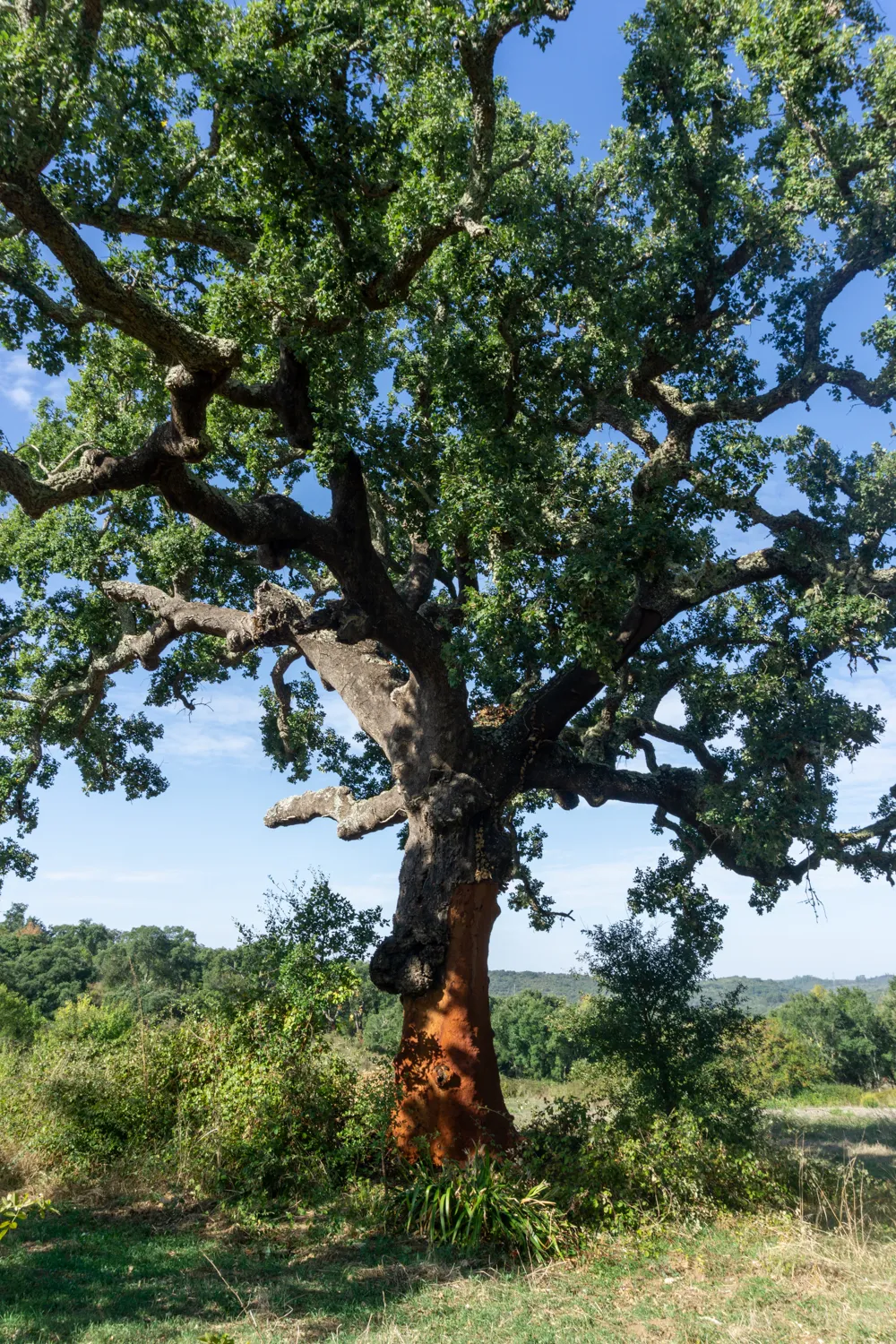 Het pad erna volgt regelmatig een lange autoweg (warm!), maar slaat gelukkig af en toe af naar bossen vol eucalyptus en kurk. Er staan een paar prachtige bomen, het zijn net kunstwerken.