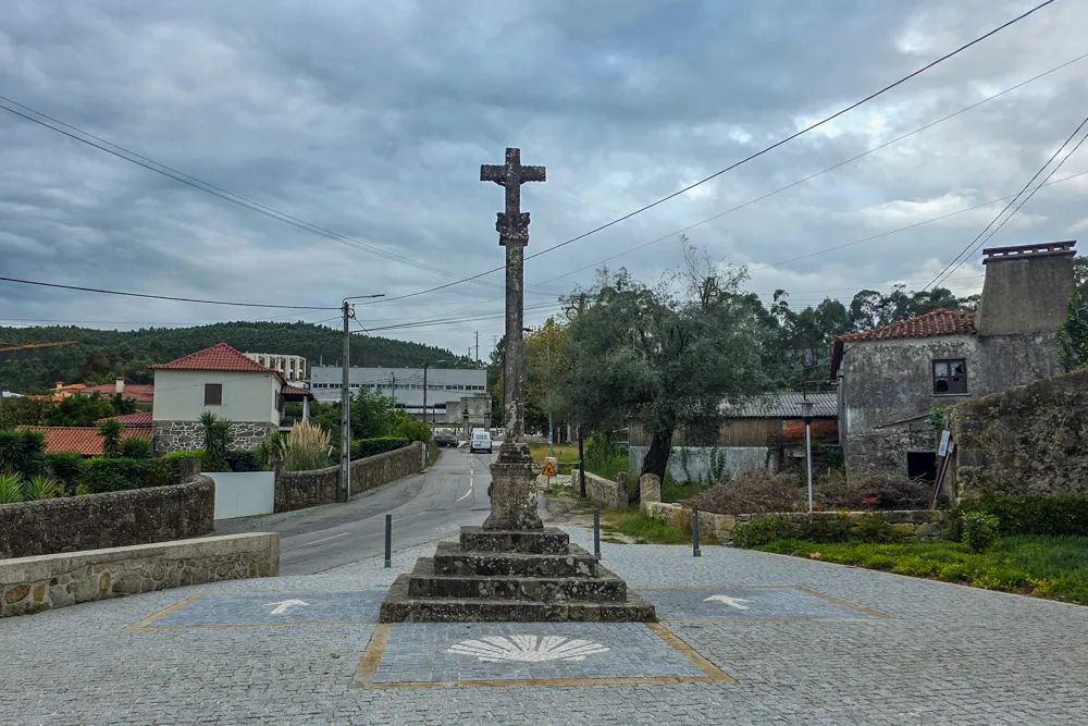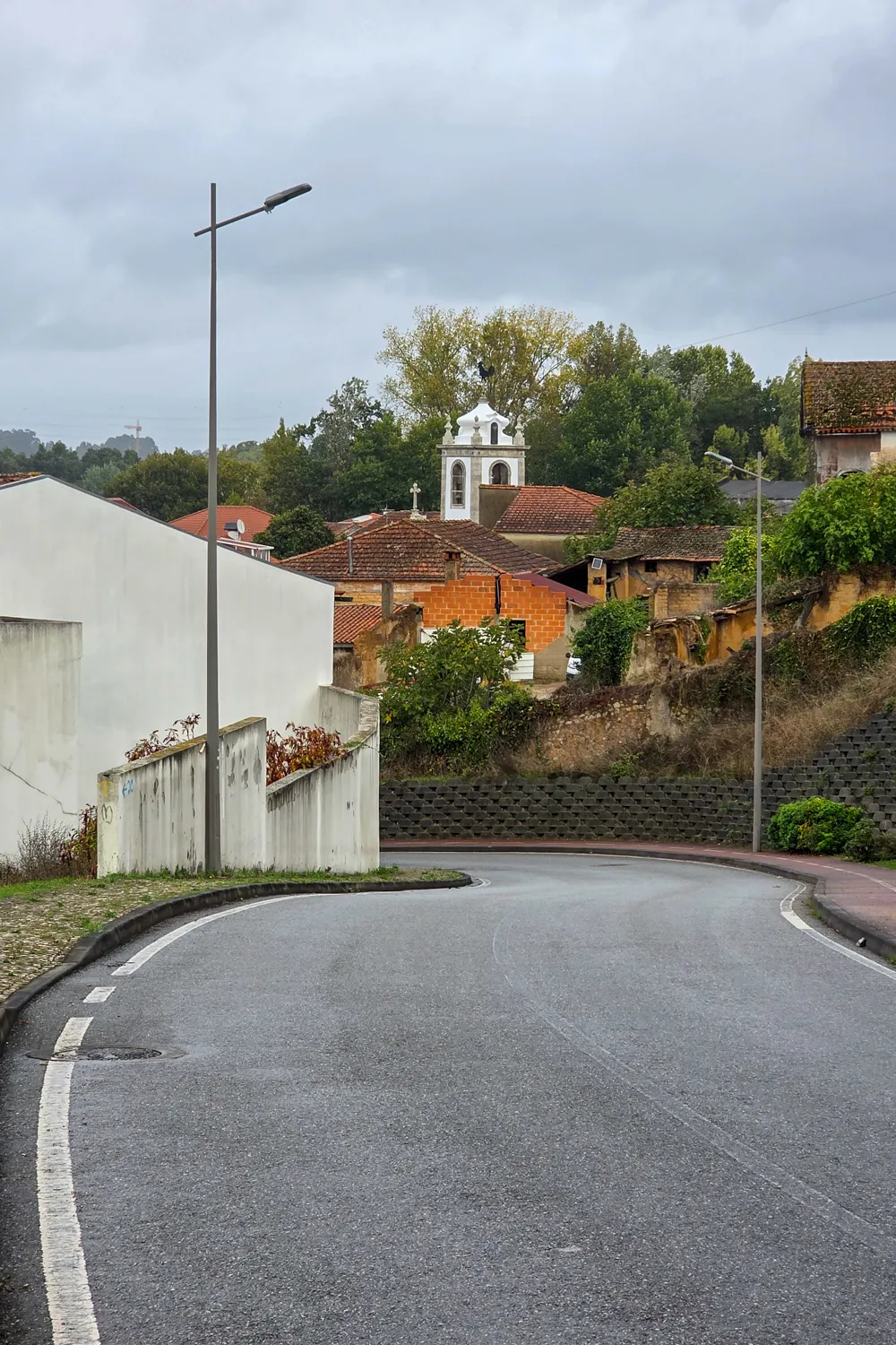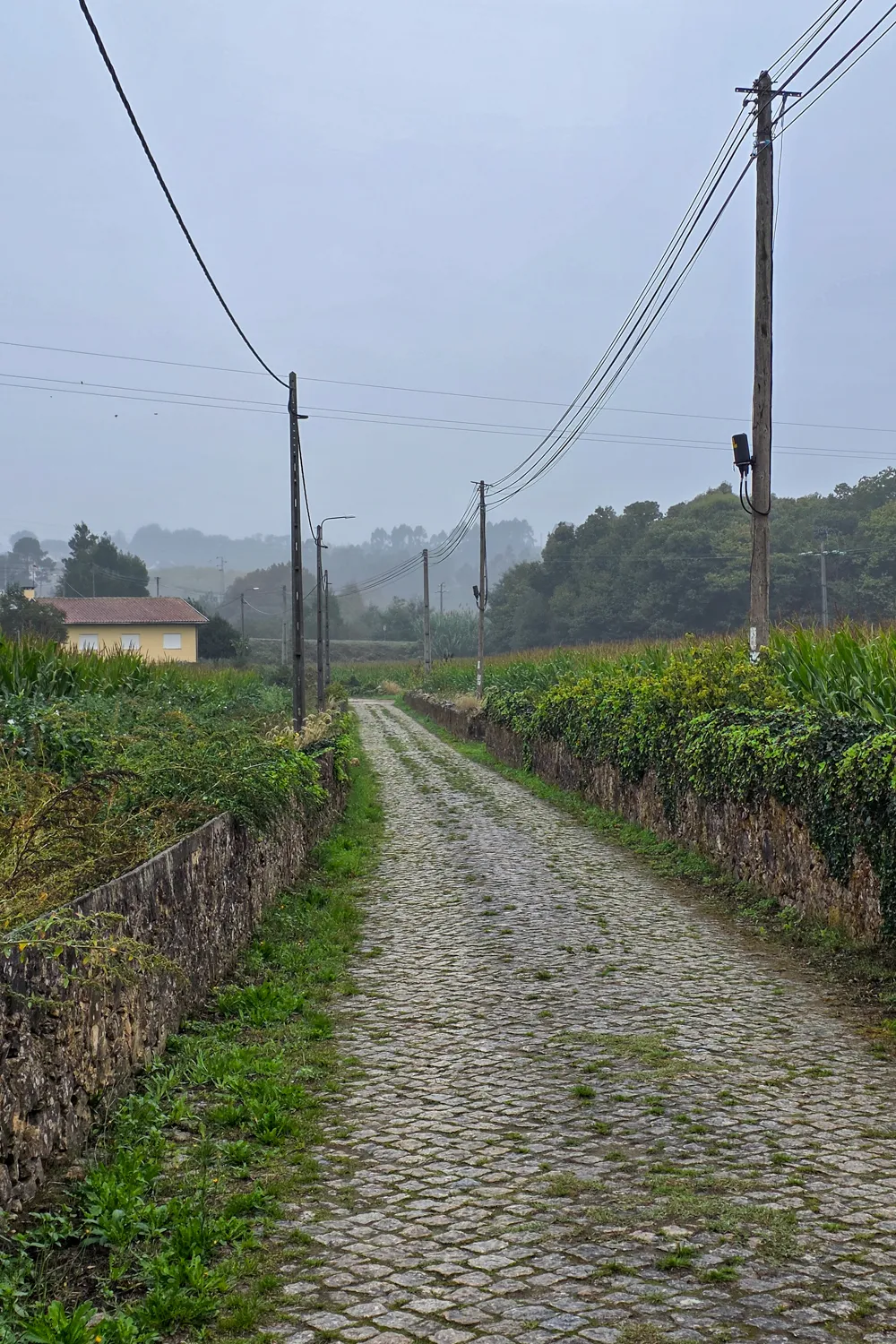 Het is nog donker als ik samen met Rob de herberg verlaat. We moeten vandaag 36 kilometer lopen omdat er weinig accommodaties op de route zijn, daarom vetrekken we al om 7 uur. In het licht van mijn hoofdlamp zie ik een grote pad voor onze voeten springen. Cool! Gelukkig hoeven we nu niet door de jungle en zijn we al snel in de verlichte straten van Pinheiro da Bemposta. We steken in korte tijd twee keer mijn favoriete N1 over, maar daarna volgt een flink stuk over smalle wegen door dorpen. Sommige zien eruit als ze al 1000 jaar gebruikt worden, het begint een beetje op Galicië te lijken hier. Ik hou mijn regenjas aan vandaag, want het miezert een beetje.