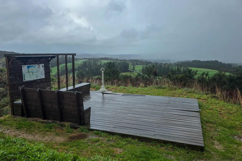 After a second coffee break, I have only six kilometers left. It is a tough hour. A steep climb and the sky opens again. Ironically, at the viewpoint on top it is dry for half a minute and I can glimpse a bit of the scenery. It must be stunning in clear weather.