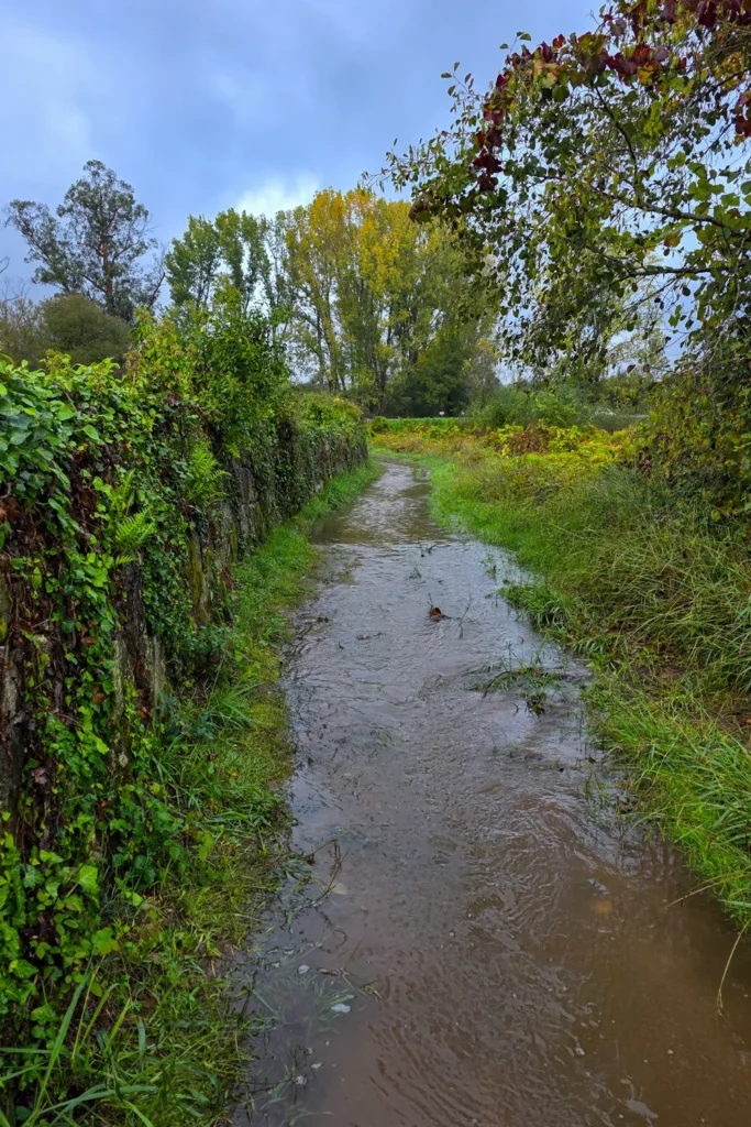 Once I cross the bridge the first challenge appears. The path is mostly flooded. I walk about a kilometer and a half barefoot, which keeps my socks and shoes dry.