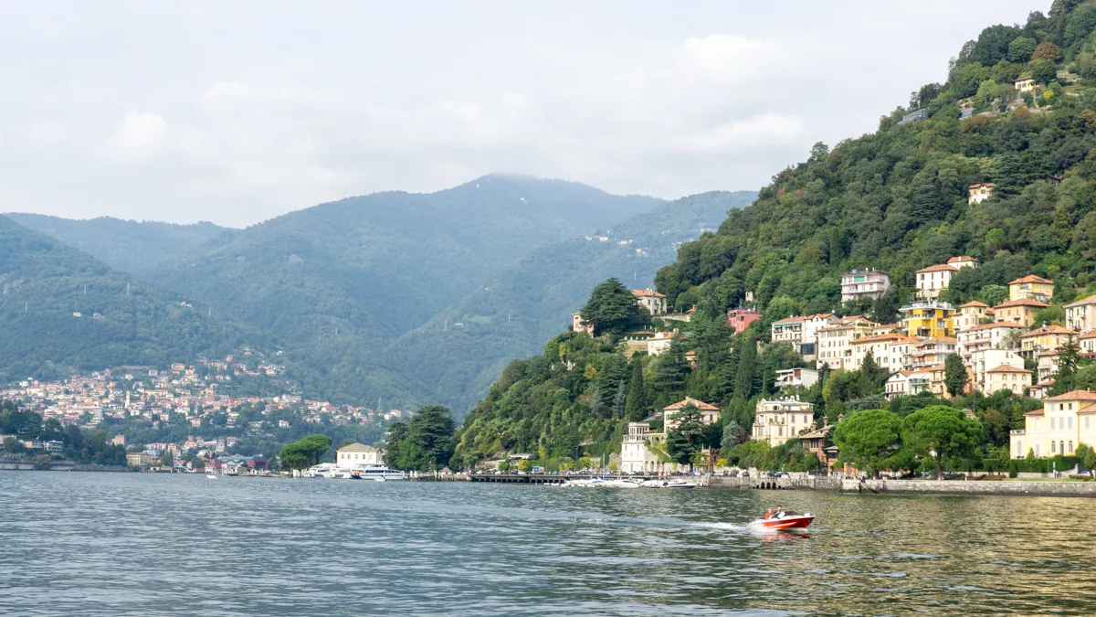 I took the train to the town of Como because I wanted to see for myself what makes this famous lake so special. Although the weather wasn’t quite cooperating and it was drizzling a bit, oddly enough, it actually felt quite peaceful. Despite the gray haze, I immediately saw that this is a special place: beautiful stately villas by the water, gardens full of colorful flowers and statues, green hills, and boats zipping back and forth across the lake.