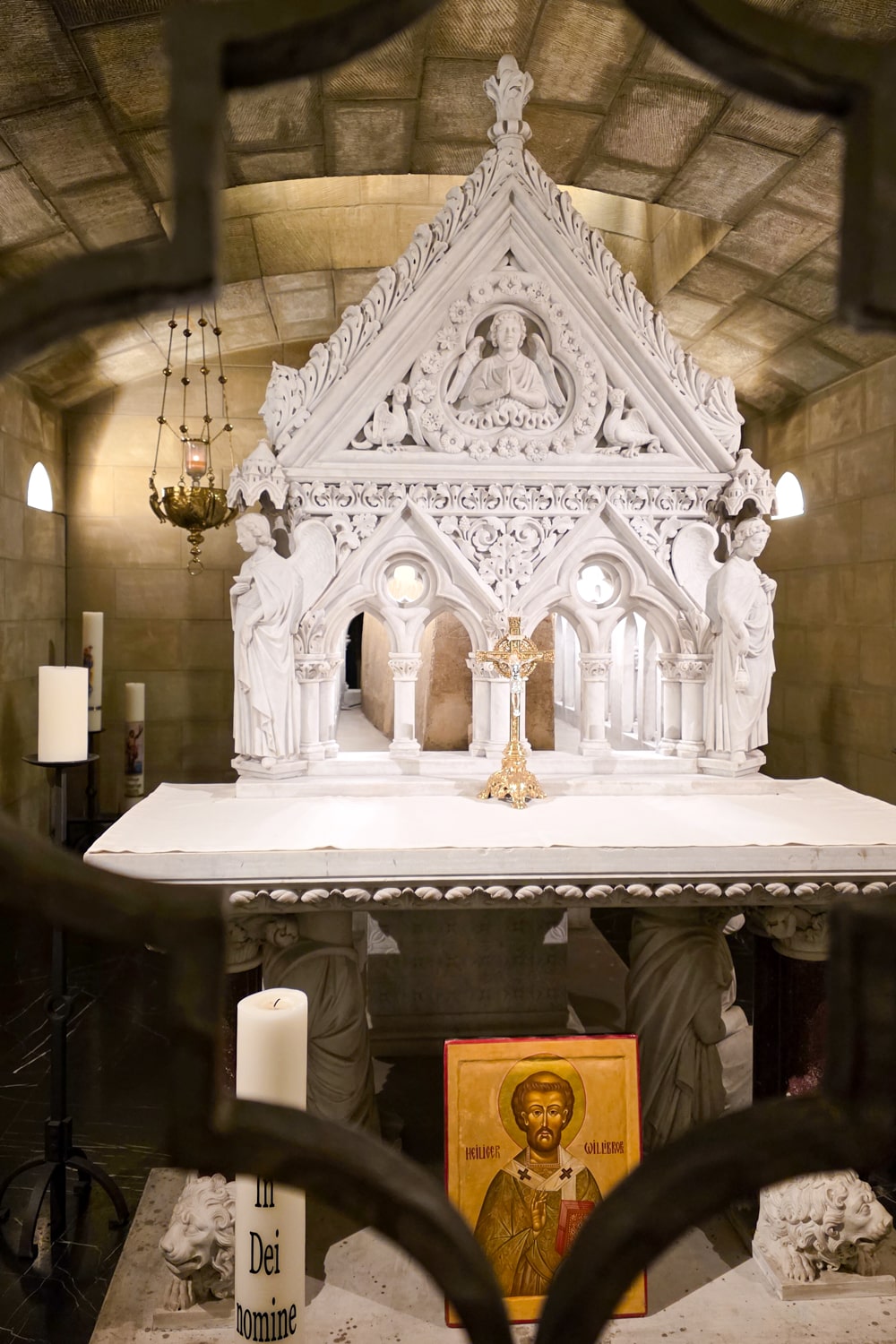 Daal ook even de trap af naar de crypte, waar het graf van Willibrord ligt. Hij is de enige heilige die in Luxemburg begraven is. Een stille, ingetogen plek die je echt even gezien moet hebben.