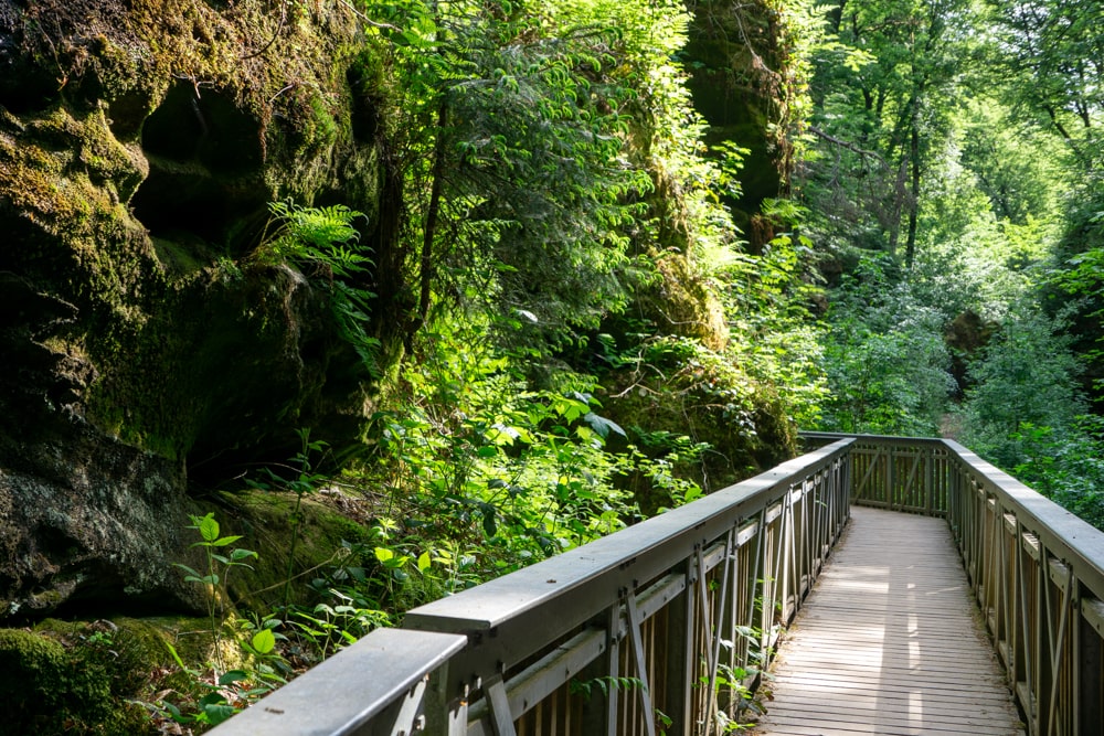 Iets voor het dorpje Mullerthal kom ik langs een van de mooiste plekken in de regio: de Schiessentümpel-waterval. Als ik arriveer, staat het bruggetje boven de waterval vol mensen, er is net een bus gestopt. Vijf minuten later ben ik helemaal alleen en kan ik de waterval in alle rust bewonderen.