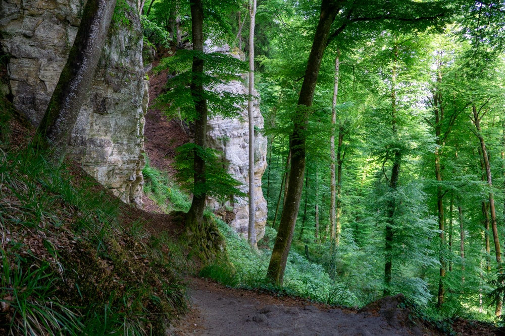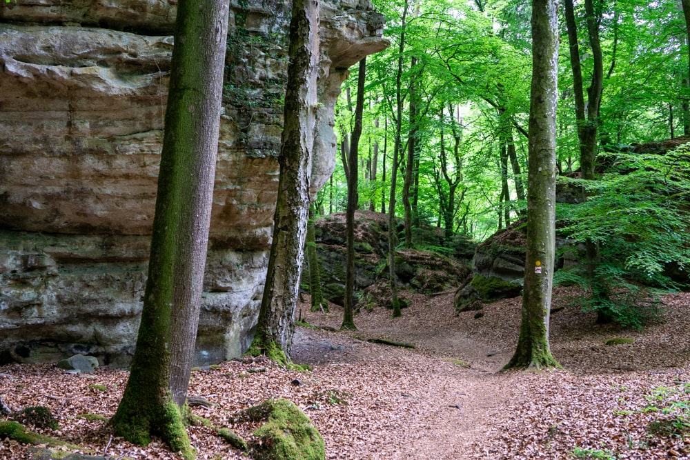 Omdat ik de eerste dag al een groot deel van Route 2 heb gelopen, is de wandeling op dag 2 relatief kort. Na het ontbijt neem ik de bus terug naar Consdorf (die gaat gelukkig elk half uur) en tien minuten later sta ik weer op het pad. Ik hoor af en toe auto’s – niet gek, want ik loop vlak langs een autoweg. Die zie ik verder amper; ik loop vrijwel alleen in het bos. Ook hier is het flink rotsachtig en moet ik af en toe klimmen om verder te gaan met mijn tocht.