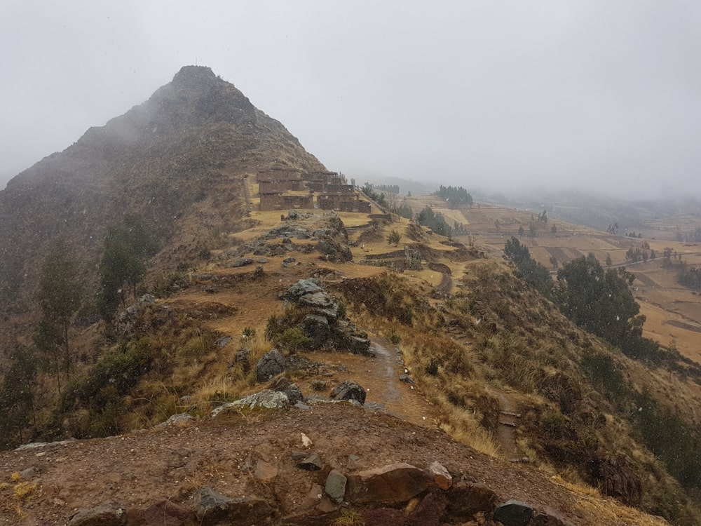 De communicatie is erg onduidelijk, maar we worden op gegeven moment de bus uit gedirigeerd bij een of andere Inca-ruïne. Het sneeuwt nog steeds en de bewolking hangt laag, waardoor we er amper iets van zien. De rondleiding gaat ook volledig in het Spaans en hoewel ik daar af en toe wel wat van begrijp, kan ik het grote verhaal echt niet volgen. En ik ben bij lange na niet de enige die niet zo goed Spaans spreekt.