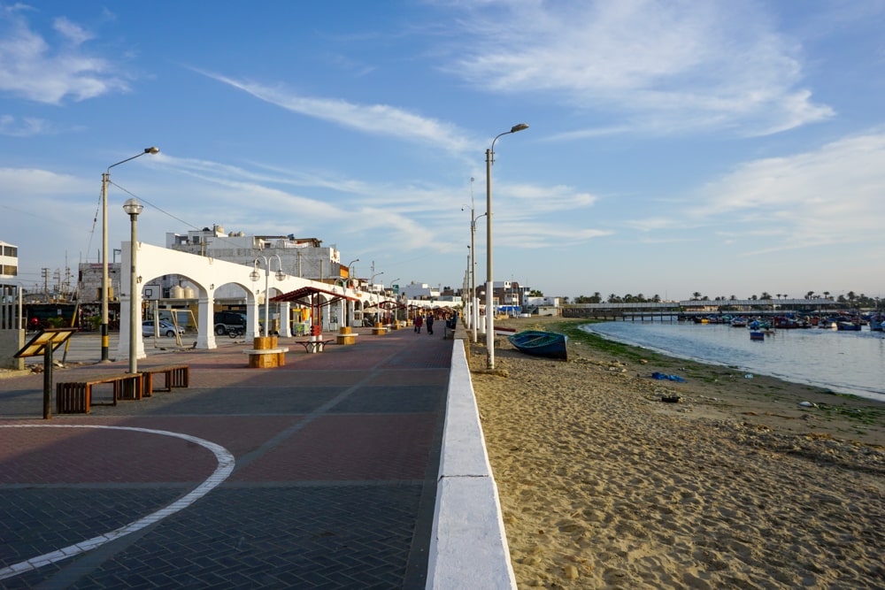 Na een stop bij Playa Rioja (een rood strand) zie ik een klein dorpje en een hoop vissersboten, een goede plek om te lunchen. Na een pittige rit (weer wind tegen en de weg is niet normaal zo slecht) kom ik daar aan en gaat spontaan de zon schijnen. Die had ik niet meer verwacht vandaag! In het zonnetje geniet van ik van een lekker visje met patat.