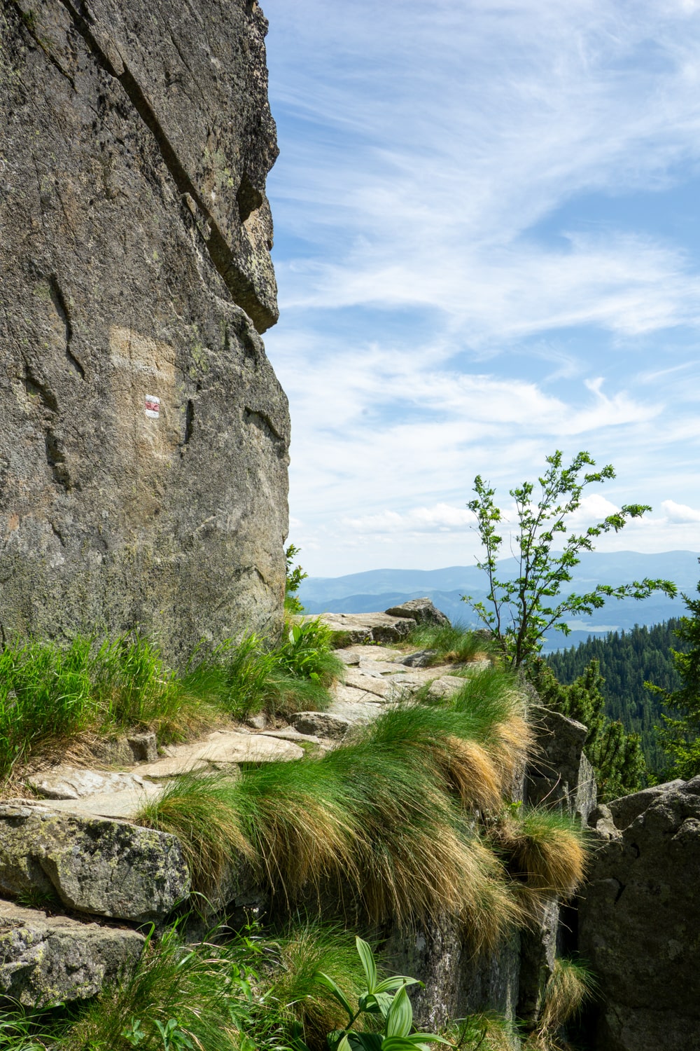 De afdaling gaat rustig aan, al blijf je lang over rotsblokken lopen voordat je weer in het bos terechtkomt. Je volgt overigens de hele tijd de gele route. Pas aan het eind loop je via de rode route terug naar Štrbské Pleso.