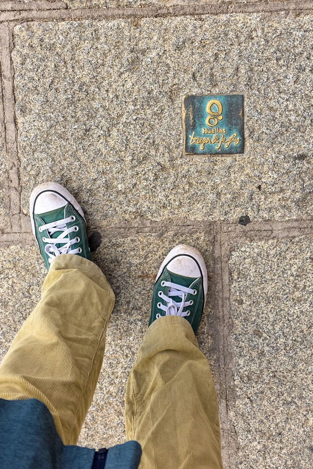 De markeringen kom je overal in de straten tegen. Het symbool is een voetstap met een rondje ernaast, dat staat voor de wandelstok van Teresa.